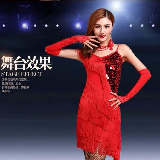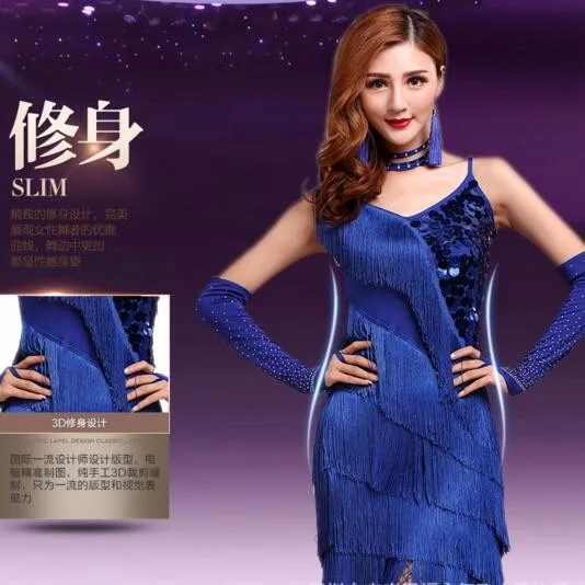 エレガントなセクシーな不等女性女の子スパンコールフリンジタッセルスカートレディースラテンタンゴ社交サルサダンスドレス